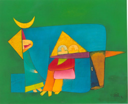 Tôi thấy nhiều tranh của Thành Chương có những trẻ chăn trâu, những cánh diều, cái nón, mặt trăng, chân dung tự họa, những hình hài đan chéo vào nhau thành các bố cục lập thể ngẫu hứng bất ngờ, những cái mặt ngửa lên trời hoặc lấp ló hoặc nghẹo đầu rất kiểu “dân gian”, nhiều tính ước lệ giống như ở các hình chạm khắc đình làng Việt Nam, nơi các phường thợ xưa kia nhiều khi do bản gỗ hẹp mà phải tùy tiện co kéo hình, bất chấp tỷ lệ, thế mà sản phẩm lại trở nên vui nhộn, dí dỏm. Tranh dân gian Việt Nam đôi khi cũng có gì đó đùa nghịch nghiêng ngả từa tựa như vậy. Về màu sắc thì Thành Chương dùng đủ những màu sặc sỡ nhất, táo bạo nhất, đôi khi có thể nói là lòe loẹt như màu phẩm. Đó là những màu như cánh sen, đỏ son, đỏ điều, xanh nõn chuối, cánh chả, vàng kim, vàng hòe… (loại màu mà các họa sĩ sơn dầu thường e ngại, tránh dùng). Rất tiếc, đó cũng lại là những màu sắc ta thường thấy ở trang phục và trang trí lễ hội làng quê Việt Nam, mớ ba mớ bảy- tung tẩy sặc sỡ. Con mắt người làng cho rằng càng nổi bật bao nhiêu càng đẹp bấy nhiêu.